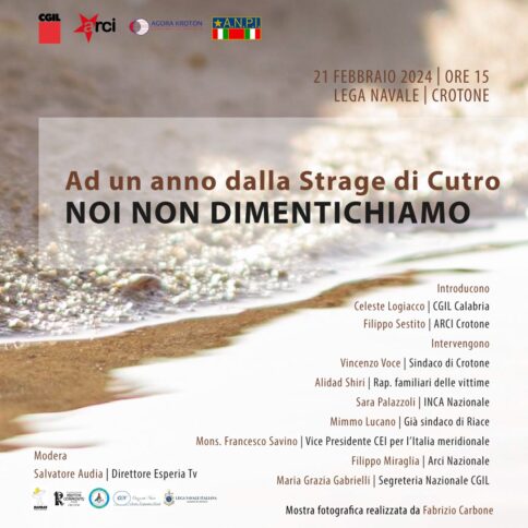 CUTRO Cgil Calabria e Cgil Area Vasta, insieme a l’Arci, La Cooperativa Agorà Kroton, l’Anpi, la Cooperativa Sociale Baobab, la Cooperativa Sociale Kroton Community, la Prociv Arci Isola di Capo Rizzuto, la Cooperativa Sociale Orizzonti Nuovi, hanno organizzato ad un anno dalla tragedia di Steccato di Cutro, presso la Lega Navale di Crotone, l’iniziativa “Noi non dimentichiamo”. Lo scopo è non solo quello di ricordare ed esprimere nuovamente cordoglio per le quasi cento vite perse in mare, tra i quali numerosi bambini, ma anche quello, in attesa che la giustizia faccia il suo corso, di riflettere e denunciare. «Il decreto Cutro non ha risolto il problema degli sbarchi e non ha migliorato le condizioni e le prospettive dei migranti – dichiara Celeste Logiacco, Segretaria Cgil Calabria con delega all’Immigrazione – anzi, le ha ulteriormente peggiorate. Ecco perché riteniamo non sia più rinviabile promuovere soluzioni e politiche di immigrazione e accoglienza diverse da quelle attuali. Accoglienza che la nostra Calabria continua a praticare ma che crediamo possa essere fatta in maniera diversa. Indispensabile in tal senso partire dalle opportunità dell’immigrazione per la nostra terra, dal ripopolamento delle zone interne destinate allo spopolamento, alla mancata chiusura delle scuole, fino alla riscoperta degli antichi mestieri».