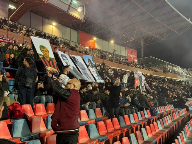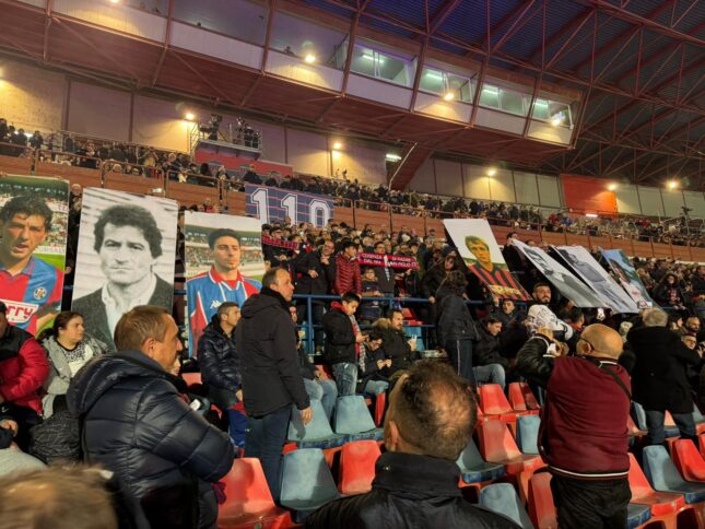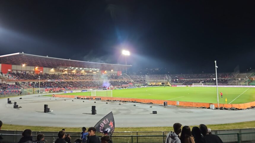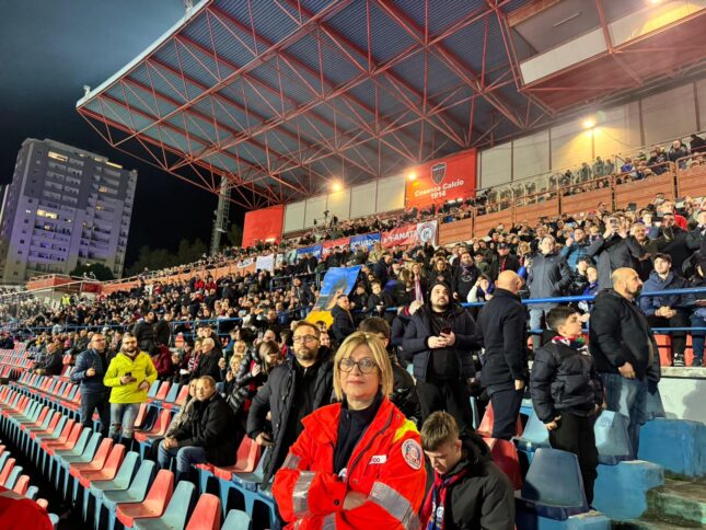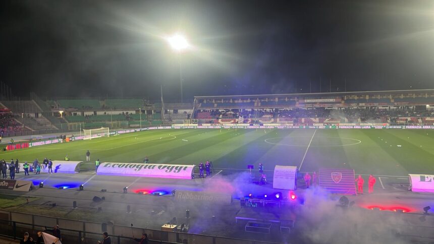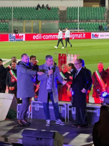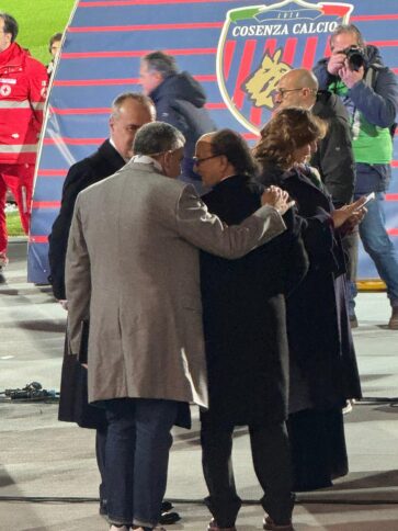 Un palco a bordocampo, uno stadio quasi pieno colorato di rossoblu a fare da contorno. E ancora: le gigantografie di chi ha segnato la storia del club, le bandiere alte della curva Sud. La grande festa del Cosenza è iniziata tra gli applausi dei tifosi, già presenti sugli spalti abbondantemente in anticipo rispetto al calcio d’inizio per celebrare la storia della società rossoblu. Sul palco istituzioni e vecchie glorie, tra cui gli ex Loviso, Stella, Baclet, Urban, De Pascalis e Occhiuzzi. Presente anche l’ex Trinchera, l’allenatore della promozione in Serie B, ora direttore sportivo al Lecce. Tra un coro e un altro, anche spazio per una battuta sul sogno Serie A tra Di Marzio e Guarascio, con il giornalista che riesce a strappare la “promessa” della promozione al presidente dei lupi.