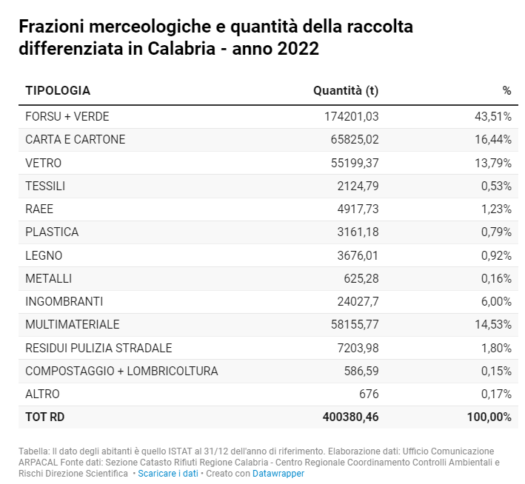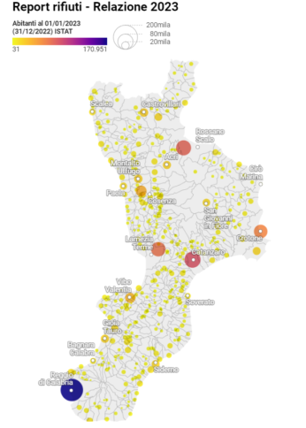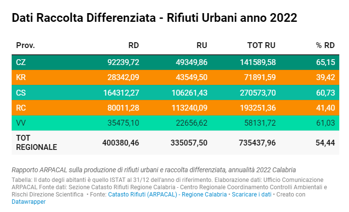 Tutti i dati riportati nella mappa e nelle tabelle sono sviluppate con Datawrapper dall’Ufficio Comunicazione dell’Arpacal, con dati raccolti da Fabrizio Trapuzzano, del Servizio Catasto Rifiuti di Arpacal e da Clemente Migliorino, direttore del Centro Monitoraggio e Controlli dell’Agenzia.