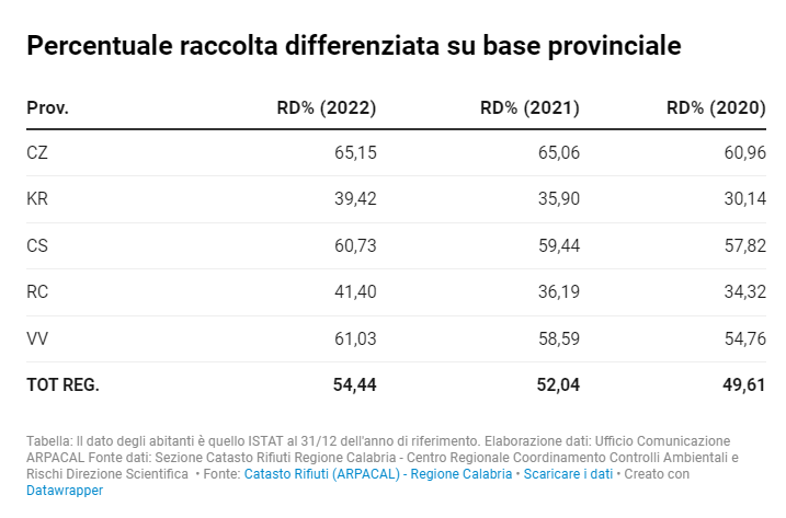 Ogni cittadino calabrese differenzia, mediamente, su base provinciale, in un anno, 270,49 Kg (Catanzaro), 244,90 Kg (Cosenza), 387,12 Kg (Vibo Valentia), 174,97 Kg (Crotone) e 154,70 Kg (Reggio Calabria).