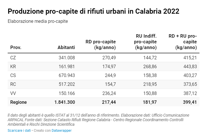 Dal confronto con le altre regioni del Sud e con la media italiana, sommando la produzione di Raccolta differenziata ed indifferenziata, emerge che, mediamente, ogni abitante della Regione Calabria produce, ogni anno, quasi 400 Kg di rifiuti: 53 Kg in meno della media pro-capite che si registra in Sud Italia (453,80 Kg) e ben 93 Kg in meno rispetto alla media italiana (493,60 Kg) (Fonte ISPRA).