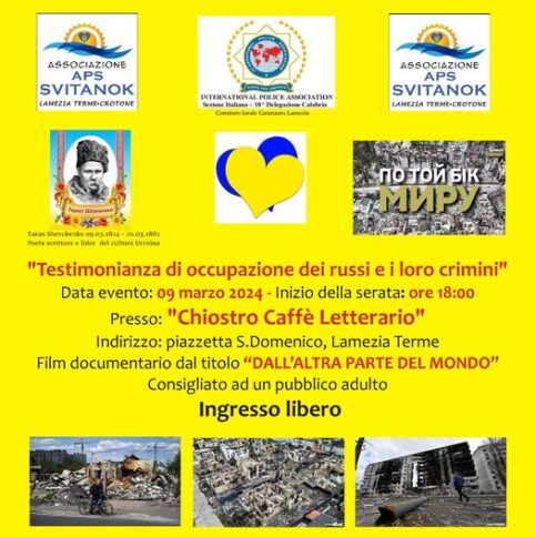 LAMEZIA TERME L’ “Associazione Svitanok”, l’”International police association” e gli ucraini di Lamezia Terme hanno organizzato una serata informativa “Testimonianza dell’occupazione dei russi e loro crimini”. L’appuntamento è per questa sera, a partire dalle ore 18, al “Chiostro Caffè Letterario”, nella piazzetta San Domenico a Lamezia Terme.