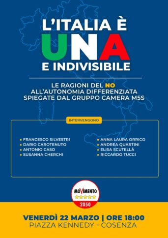 COSENZA «Venerdì 22 marzo in piazza Kennedy a Cosenza, dalle ore 18:00, il Capogruppo del Movimento 5 stelle alla Camera dei deputati Francesco Silvestri, insieme ad una rappresentanza di parlamentari pentastellati provenienti da tutta Italia, incontrerà attivisti e cittadini per spiegare le ragioni del no all’Autonomia differenziata». Lo afferma in una nota la deputata Anna Laura Orrico, coordinatrice regionale del M5S calabrese. «L’incontro – dice Orrico – rientra in una più ampia gamma di iniziative portate avanti dal Movimento già dallo scorso anno con il tour calabrese realizzato con Roberto Fico come testimonial che culmineranno con il corteo cittadino di sabato 23 marzo nel quale, insieme ad altre forze politiche, sindacati, associazioni, amministratori, liberi cittadini, attraverseremo Cosenza per sensibilizzare i calabresi sui pericoli imminenti dello sciagurato provvedimento voluto dal governo Meloni». Infatti, «L’Italia è una e indivisibile’ è stato il nome che abbiamo voluto dare all’appuntamento». Lo dice la nostra Costituzione, rappresenta l’idea stessa che abbiamo del nostro Paese, eppure il rischio che una secessione economica possa realizzarsi si concretizza ogni giorno di più.