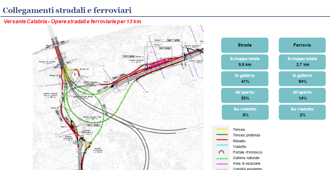 Sul versante calabrese sono previste opere stradali e ferroviarie per 13 chilometri.