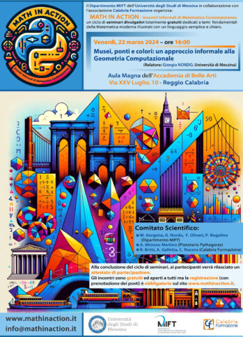 REGGIO CALABRIA Oggi, venerdì 22 marzo, alle ore 16, col primo incontro dal titolo “Ponti, Musei e Colori: un approccio informale alla Geometria Computazionale” presso l’Aula Magna dell’Accademia di Belle Arti in via XXV Luglio 10, Reggio Calabria prenderà il via il tanto atteso ciclo di seminari Math in Action. Questa iniziativa è frutto della collaborazione tra il Dipartimento Mift dell’Università di Messina e l’associazione Calabria Formazione, nell’ambito delle cosiddette attività di Terza Missione. L’intero Comitato Scientifico, composto da Matteo Gorgone, Giorgio Nordo, Francesco Oliveri e Patrizia Rogolino del Dipartimento Miftdell’Università di Messina, Angela Misiano Martino del Planetario Pythagoras di Reggio Calabria, Romano Britti, Antonio Galletta e Carmelo Nucera di Calabria Formazione, invita studenti, appassionati d’arte, curiosi della scienza e chiunque sia alla ricerca di una nuova avventura intellettuale a partecipare all’evento di questo pomeriggio di esplorazione che intreccerà Arte, Storia e Matematica. L’iniziativa è completamente gratuita, ma i posti sono limitati. Pertanto, per assicurarsi un posto tra il pubblico e ricevere, al termine del ciclo di seminari, un attestato di partecipazione, è indispensabile registrarsi online attraverso il modulo disponibile al seguente indirizzo https://mathinaction.eventbrite.it o visitando il sito web ufficiale all’indirizzo www.mathinaction.it.