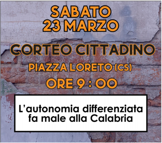 I firmatari dell’appello-manifestano parlano di «un processo che si è sostanziato con le politiche di smantellamento dei servizi sociali (sanità e scuola pubbliche in primis), di attacco ai salari e ai diritti sul lavoro, di aumento smisurato della precarietà e dello sfruttamento. Scelte politiche volute dai Padroni e dai Banchieri che hanno causato l’allargamento delle diseguaglianze sociali e territoriali e le oscene devastazioni ambientali in nome della crescita a dismisura dei profitti e delle rendite, la pervasiva militarizzazione e la partecipazione ai criminali preparativi di guerra. Per questo il nostro scendere in piazza il 23 marzo contro l’Autonomia Differenziata (concentramento alle 9.00 a piazza Loreto) è scendere contemporaneamente in piazza contro le riforme che stanno smantellando la Scuola pubblica come l’ultima revisione targata Valditara dei tecnici e professionali, contro la devastazione della Sanità pubblica, per l’introduzione del Salario minimo e di una Legge che introduca il reato di Omicidio sul Lavoro, per l’introduzione di una tassazione che colpisca i grandi patrimoni, per il drastico taglio delle spese militari, l’invio di armi in giro per il mondo, il rifiuto della guerra e l’opposizione ai disegni imperialista. Mobilitiamoci tutte e tutti!».