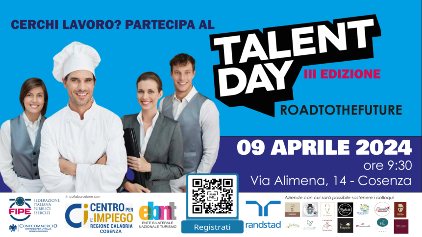 COSENZA Confcommercio Cosenza organizza la III Edizione del Talent Day Fipe, con lo slogan “Road to the Future”. L’evento si terrà il prossimo 9 aprile 2024, alle ore 9:30 presso la sede di Confcommercio in Via Alimena, 14 Cosenza. L’obiettivo principale di questa giornata è creare una sinergia tra persone in cerca di lavoro e le aziende del settore, al fine di contrastare efficacemente il problema della disoccupazione. Il valore aggiunto di questa edizione è la partecipazione attiva del Centro per l’Impiego di Cosenza che garantirà un valido supporto nell’individuazione dei fabbisogni professionali delle imprese del territorio facilitando così l’incontro tra domanda e offerta di lavoro in un settore nevralgico quale il turistico alberghiero. Tutti gli interessati in cerca di occupazione potranno prendere visione delle offerte di lavoro attraverso un panel dedicato nonché prenotare un colloquio con le aziende aderenti all’iniziativa, attraverso un sistema di speed-date compilando un apposito form disponibile al seguente link. Il Talent Day, oltre a promuovere le aziende e le relative offerte lavorative, vedrà coinvolti anche gli Istituti Scolastici, attraverso il progetto Insieme Creiamo il Futuro – Cosenza, finalizzato a rendere più efficaci i processi di transizione dalla scuola al mercato del lavoro. Durante l’evento saranno inoltre presenti desk informativi e si terrà un workshop dedicato su temi cruciali: le tipologie contrattuali, i tirocini formativi, il recruiting, la gestione dei curricula e dei colloqui, politiche attive e inclusive promosse dalla rete territoriale.