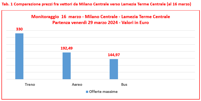 CATANZARO «Federconsumatori Calabria ha ritenuto dare un ultimo sguardo vigile sull’andamento dei costi del viaggio dalle principali città italiane verso la Calabria per avere il quadro completo delle offerte nell’imminenza della Pasqua e poter fare un ulteriore confronto rispetto al monitoraggio regionale di sole 2 settimane addietro quando già denunciammo i nuovi aumenti applicati su treno, aerei e bus rispetto allo scorso anno e con il prezzo dei treni divenuto in molti casi più alto di quello dei voli». È quanto viene evidenziato in una nota di Federconsumatori Calabria Aps.