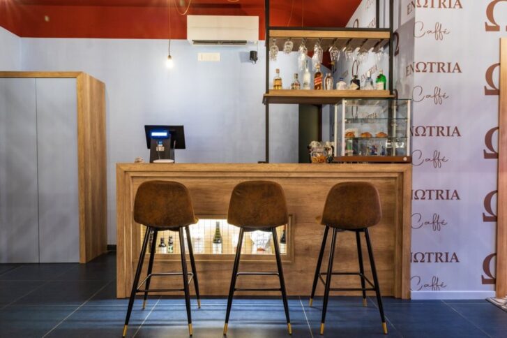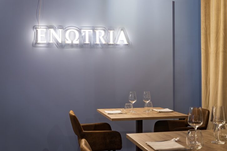 Nei circa 100 metri quadrati del Caffè Ristorante Enotria la cucina occupa un posto centrale. Durante la fase progettuale è stato importante dare multi-funzionalità agli ambienti perché l’esigenza dei proprietari era quella di offrire servizi anche diurni e di pre-cena, colazione ed aperitivi, mantenendo comunque l’attività del ristorante come primaria e principale.
