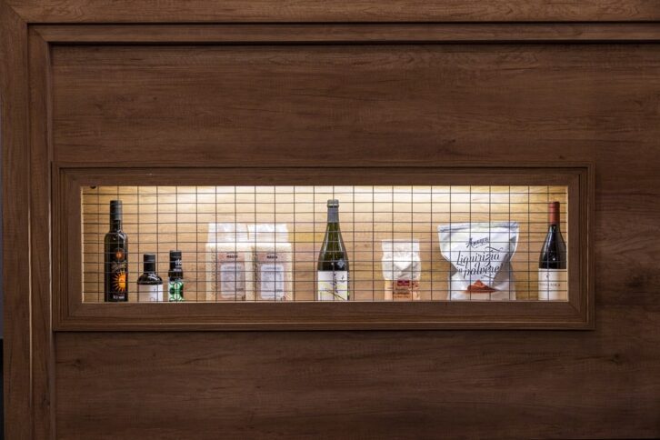 Il bar è composto da un mobile in legno, luminoso, con griglia a vista per l’esposizione dei prodotti del territorio che lo chef usa in cucina. La sala è arredata da tavoli, poltroncine e due panche in legno. I colori usati sono ruggine e azzurro. Predomina il legno rovere.