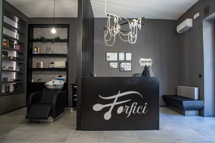 Ma anche la parte esterna si caratterizza in tema di dettagli e scelta accurata di materiali: la vetrina di ingresso è lineare, con profili sottili neri, la porta in vetro a tutta altezza, completamente circondata perimetralmente da un imbotto in metallo nero opaco e l’insegna luminosa FORFICI HAIR STYLE in metallo argento applicata al centro dell’imbotto.