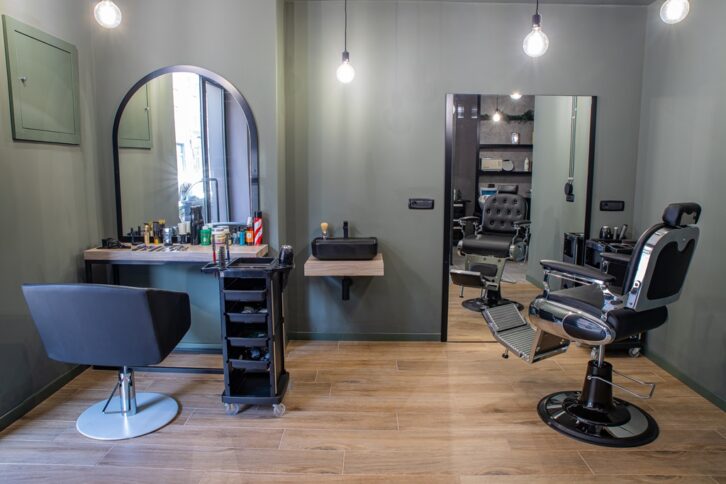 L’area taglio è evidenziata da un pavimento in legno che si aggiunge a quello con effetto cemento nel resto del salone. È completamente incorniciata dal verde delle pareti che si congiunge al grigio delle restanti superfici. Una postazione taglio, un piccolo lavandino sospeso, appoggiato su mensola in legno, ampi specchi ed una sedia vintage per taglio e barba completano il design interno.