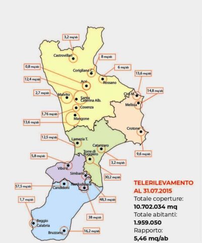 Il blitz dello scorso gennaio, è solo l’ultimo in ordine di tempo effettuato dalle forze dell’ordine. Una operazione che riaccende i riflettori sul rischio amianto. L’Osservatorio nazionale amianto (Ona) segnala la presenza di 40 milioni di tonnellate in un milione di siti distribuiti in tutto il Paese. La cartina della Calabria (nella foto in basso) riporta i dati sulla presenza di edifici con coperture in cemento amianto per alcune località secondo il telerilevamento effettuato nel 2015. Da rilievi che l’Ona Cosenza ha effettuato in alcuni comuni per la redazione del Piano Comunale Amianto risulta mediamente una sottostima variabile dal 20% al 30% dovuta alla procedura.