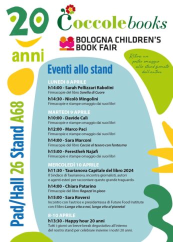 Sono 1500 gli espositori provenienti da circa 100 Paesi e regioni del mondo che saranno presenti alla Fiera di Bologna da circa 100 Paesi e regioni del mondo. Coccole Books sarà al Padiglione Hall 26 stand A68 con una serie di firmacopie ed incontri. Lunedì 8 aprile ci saranno Sarah Pellizzari Rabolini e Nicolò Mingolini; martedì 9 Davide Calì, Marco Paci, Sara Marconi, Ferestheh Najafi; mercoledì 10 Chiara Patarino.