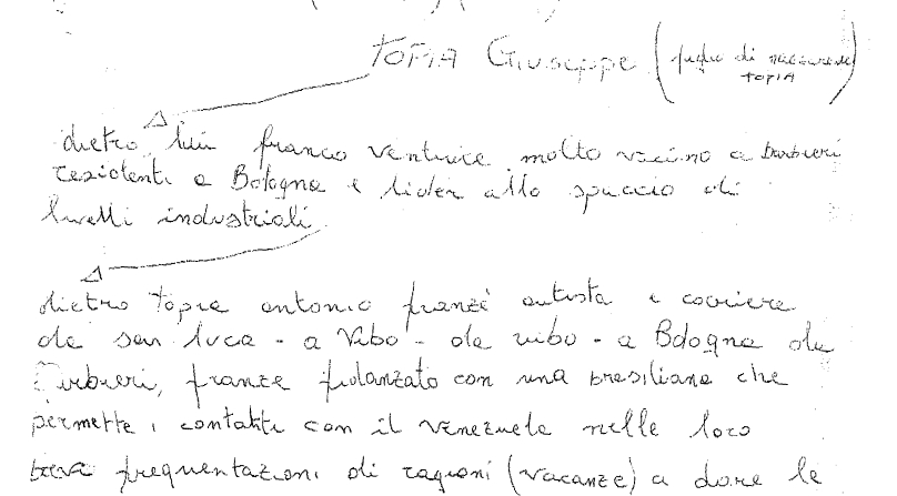 «Topia Giuseppe dietro lui Franco Ventrici molto vicino a Barbieri residenti a Bologna (…) allo spaccio di livelli industriali». E ancora: «Dietro Topia Antonio Franzè autista e corriere da San Luca a Vibo e da Vibo a Bologna da Barbieri». Nelle prime righe della lettera anonima, a tratti incomprensibile, sono citati nomi il cui peso specifico emergerà a poco a poco dai riscontri effettuati dalla Procura di Vibo Valentia. Il primo è Vincenzo Barbieri, classe ’56 di Limbadi, noto come “il ragioniere”, broker del narcotraffico ucciso poi in un agguato avvenuto il 12 marzo 2011 a San Calogero, nel Vibonese. Il secondo, invece, è Francesco Ventrici, classe ’72 di San Calogero, ritenuto vicinissimo al clan Mancuso di Limbadi e di elevatissima caratura criminale.