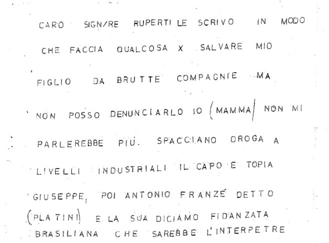 La seconda lettera, invece, viene menzionata in una relazione di servizio firmata da un agente scelto delle Polizia di Stato risalente al 16 aprile 2010. Ed è l’appello di una mamma disperata. «Caro signore Ruperti le scrivo in modo che faccia qualcosa x salvare mio figlio da brutte compagnie» scrive così un’anonima mamma che spiega poi di non poter denunciare il figlio perché «non mi parlerebbe più». Poi la denuncia: «Spacciano droga a livelli industriali. Il capo è Topia Giuseppe, poi Antonio Franzè detto Platini la sua diciamo fidanzata brasiliana che sarebbe l’interprete nei viaggi in Brasile e Venezuela». Poi l’ultimo dettaglio e una sorta di preghiera affidata ancora a Ruperti: «So anche che vanno e vengono da San Luca a Milano. La prego faccia qualcosa e non mi metta in mezzo, la prego».