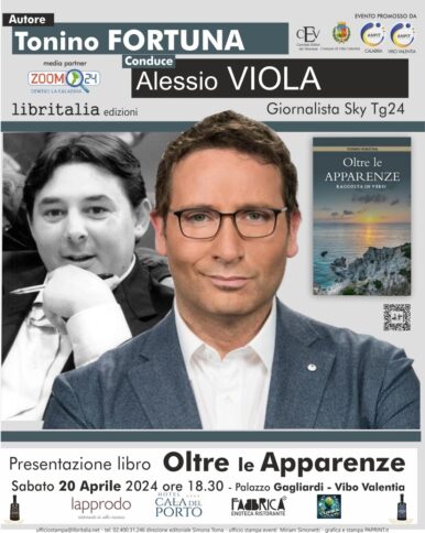 VIBO VALENTIA Verrà presentata Sabato 20 aprile alle ore 18:30 presso il monumentale Palazzo Gagliardi di Vibo Valentia, la raccolta in versi di Tonino Fortuna dal titolo “Oltre le apparenze” edita dalla casa editrice Libritalia Edizioni. I versi di Fortuna penetrano nell’anima di chi legge e ci pongono davanti ad una sinfonia di parole dolci, delicate ma anche violente e contraddittorie le quali ci accompagnano in un lungo viaggio di sentimenti ed emozioni. I suoi sono versi lievi, intensi, ruvidi e penetranti, sospesi tra il reale e il surreale, tra eventi che invadono l’intimità, divenendo intimi e vissuti.