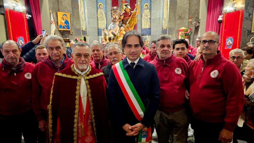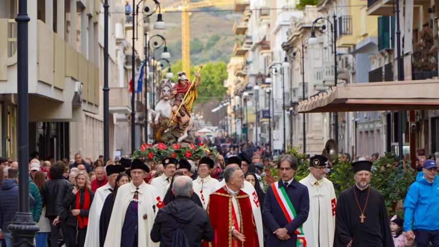 REGGIO CALABRIA «L’amministrazione comunale saluta i cittadini ed i portatori. Un ringraziamento lo rivolgo a don Nuccio Cannizzaro che ha voluto portare San Giorgio di fronte Palazzo di città e perché è importante iniziare a costruire e cementare la consapevolezza del culto di san Giorgio nella nostra città». Inizia così il discorso del sindaco Giuseppe Falcomatà rivolto alla comunità reggina nel corso della processione dedicata al San Giorgio. «Abbiamo la fortuna di avere due santi patroni, uno universale, come San Giorgio – ha aggiunto il sindaco – riconosciuto in tutto il mondo a livello internazionale, santo patrono del movimento degli scout con un culto ed una tradizione millenaria diffusa universalmente. Bisogna, dunque, recuperare l’orgoglio identitario intorno al culto di san Giorgio che parte anche con questa bellissima processione ed una nuova statua voluta fortemente da don Nuccio Cannizzaro».