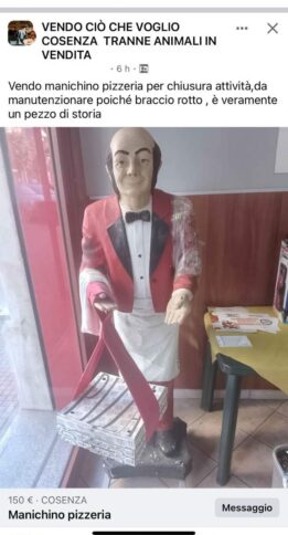 COSENZA La memoria costa 150 euro. Un tuffo al cuore può venire imbattendosi sui social in quel manichino calvo che salutava i clienti di una pizzeria oggi chiusa – dopo 25 anni di onorato servizio – e, seminascosto tra le auto in sosta, benediceva gli automobilisti che lasciano Cosenza in direzione Rende.