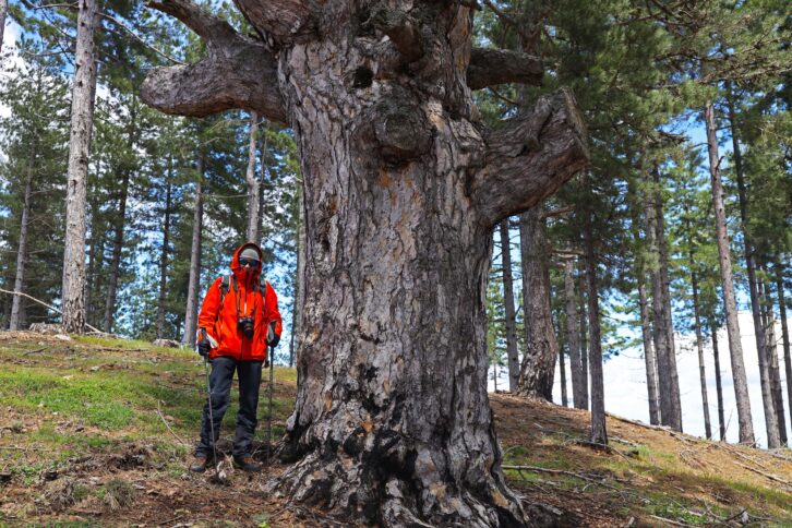 Siamo partiti, stamani, da M. Iurentino. Per tutto il viaggio in auto fin qui è piovuto. I primi passi a piedi li abbiamo fatti sotto una pioggia sferzante ed un cielo plumbeo. Ma confidavamo nella battaglia fra luce ed ombra, fra cielo e nuvole, che ora rende tragico e splendido il paesaggio della Sila Greca. Sulla cima di M. Iantrìnico, dopo avere attraversato un bosco rado di querce ed eriche fiorite: a picco sul Trionto, l’abitato di Longobucco; sopra, le fitte pinete di M. Altare. Silenzio anche qui, rotto solo dall’ululato del vento. Lasciamo la stradina forestale e ci inerpichiamo su per un ripido costone sgombro di vegetazione arborea. Sostiamo spesso, per osservare intorno. Sulla destra serpeggia la valle del Vulganera, ammantata di lecci, costellata di pareti di roccia e di frane. A mezza costa, sotto di noi, gli antichi coltivi di Ennerà con la vecchia Casa Vulcano. Una quercia ustionata dal fuoco, ma ancora viva, si protende nel vuoto, sul profilo di Serra Pigliaspica. Giungiamo così nell’area sommitale di Colle d’Arvi, dove iniziano i rimboschimenti di pini. Dell’antico bosco rimane solo un enorme pino di quasi cinque metri di circonferenza, roso nel tronco da una nera caverna scavata dai pastori. Più sotto, querce, ontani, aceri si sono ripresi naturalmente ciò che i pascoli e i coltivi avevano sottratto loro.