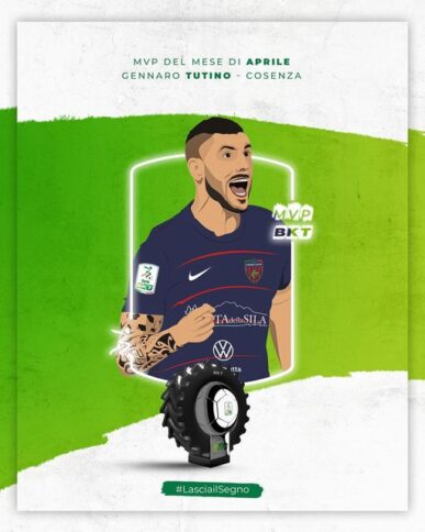 MILANO L’attaccante del Cosenza Gennaro Tutino conquista per la prima volta in carriera il trofeo MVP della Serie BKT per il mese di aprile, premio ideato dal title sponsor BKT e riconosciuto ufficialmente dalla Lega B. Chiamati a votare, come sempre, i giornalisti dei broadcaster ufficiali del campionato (Sky e Dazn) con la collaborazione di Fabio Tocco ed Emanuele Stivala, founders di “Che Fatica La Vita Da Bomber”. I dati Opta sul rendimento di Tutino nel mese di aprile dicono che i gol segnati sono 4 in 5 presenze con anche 1 assist, per un totale di 358 minuti giocati. Numeri che dimostrano quanto la punta rossoblù sia stata decisiva, avvalorati ulteriormente dalle 5 occasioni create e dai 6 tiri nello specchio: un vero e proprio cecchino. È, inoltre, il calciatore ad aver realizzato più gol in B nel periodo considerato, come pure l’unico ad aver timbrato il cartellino per quattro partite consecutive.