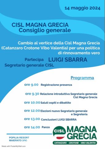 MAIERATO Sarà l’intervento del segretario generale nazionale della Cisl Luigi Sbarra a concludere, domani, martedì 14 maggio nel Popilia Resort di Maierato, il Consiglio generale della Cisl Magna Grecia – Catanzaro Crotone e Vibo Valentia, nel corso del quale verranno eletti il nuovo segretario generale e la nuova segreteria. Il Consiglio generale, che avrà inizio alle ore 9,30, sarà introdotto dalla relazione del segretario generale uscente Salvatore Mancuso.