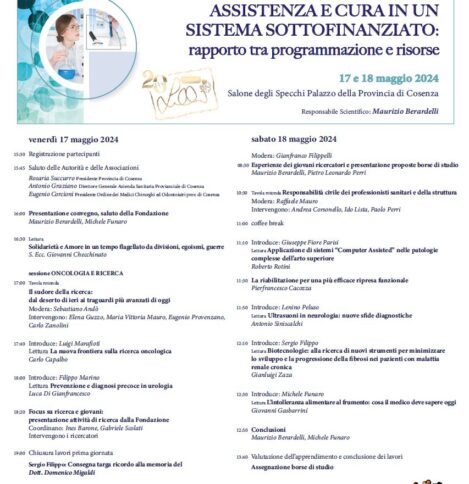 COSENZA La Fondazione Lilli Funaro, nel ventesimo anno di attività, prosegue il suo lavoro con il XVIII Convegno scientifico, intitolato “Come far convivere ricerca, assistenza e cura in un sistema sottofinanziato: rapporto tra programmazione e risorse”, che si terrà il 17 maggio 2024 dalle 15.30 alle 19.00, e il 18 maggio dalle 8.30 alle 14.00, presso il Salone degli specchi del Palazzo della Provincia di Cosenza, in piazza XV marzo.