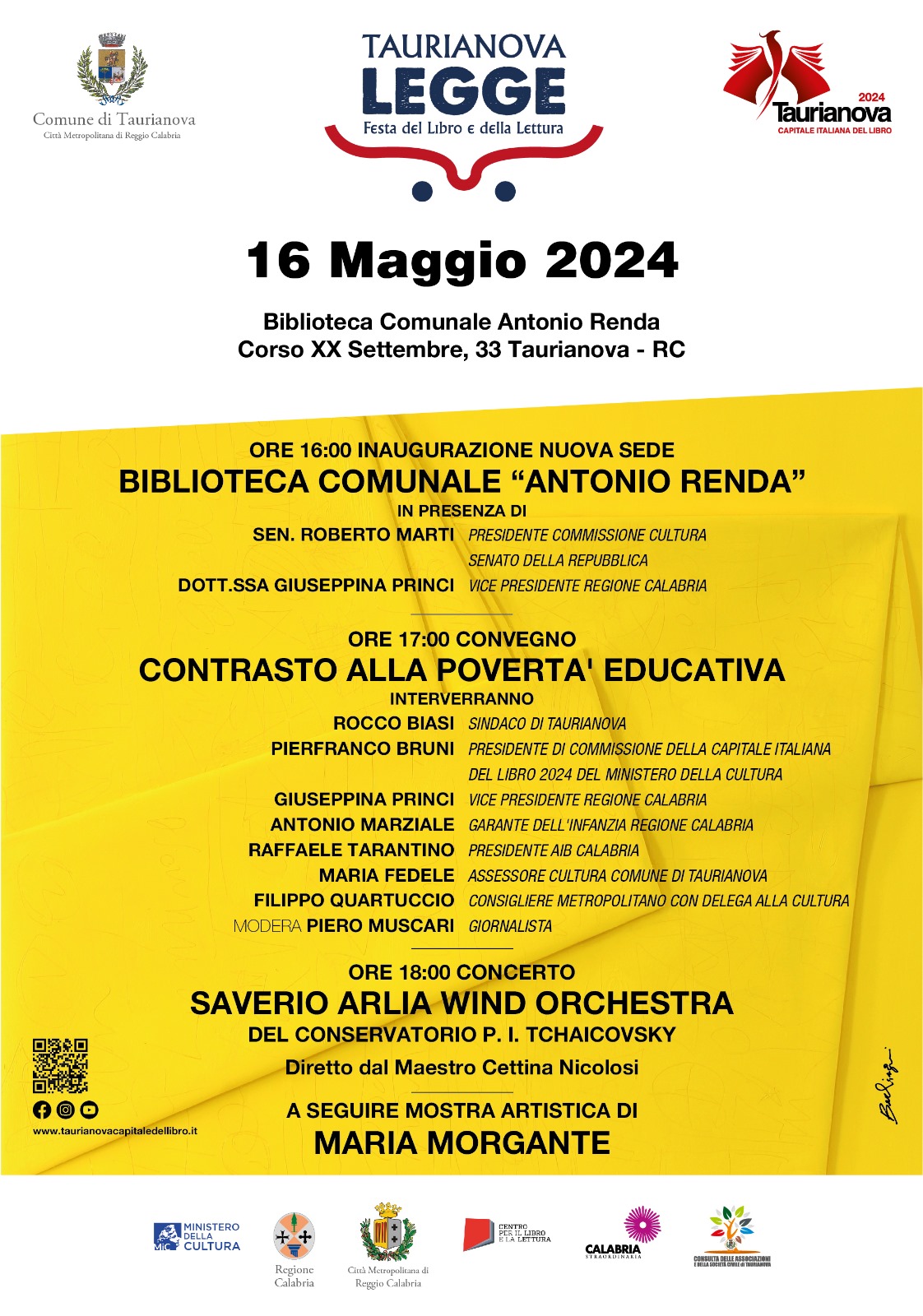 TAURIANOVA Giornata da segnare sul calendario: giovedì 16 maggio partenza ufficiale di Taurianova Capitale Italiana del Libro 2024. La città, premiata dal Cepell e dal Ministero della Cultura per l’evidente grande impatto sociale sul territorio. Si parte alle 16:00 con la cerimonia di inaugurazione ufficiale: al centro dell’evento l’apertura della nuova sede della biblioteca comunale “Antonio Renda” (Corso XX Settembre, 33, Taurianova), nello storico palazzo dell’ex municipio di Radicena, che dopo sette anni riaprirà finalmente le porte restituendo alla comunità un inestimabile patrimonio.