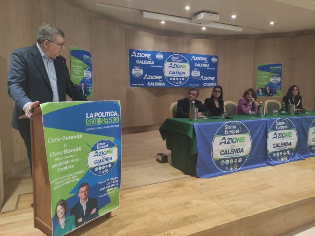 VIBO VALENTIA «Scusate il ritardo, colpa delle buche. Se Roma è la prima, Vibo è subito dopo». Esordisce con una battuta Carlo Calenda nella sua tappa vibonese del tour per presentare i candidati calabresi di Azione alle prossime elezioni Europee. Al suo fianco Elena Bonetti, il segretario regionale Francesco De Nisi, Ramona Angela Calafiore e Stefania Postorivo. Un parterre tutto composto da candidati per un posto al Parlamento europeo. «Per noi le Europee sono un passaggio fondamentale. È importante portare in Europa persone serie e preparate perché oggi l’Italia è 25esima su 27 in termini di influenza» afferma il leader di Azione ai microfoni dei giornalisti, che poi offre una disamina sullo stato della Ue: «Oggi l’Europa non è sovranazionale, è un’Europa degli Stati Europei» precisa il leader di Azione ai microfoni dei giornalisti. Tra il pubblico anche il candidato a sindaco di centro di Vibo Valentia, supportato da Azione, Francesco Muzzopappa. «Noi cerchiamo di costruire un’area di centro che vada oltre la destra e la sinistra».