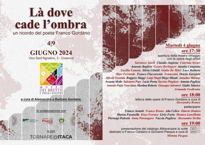 L’evento, organizzato in collaborazione con il Comune di Cosenza e la Fondazione Attilio ed Elena Giuliani, rientra all’interno delle attività del Festival nazionale della Poesia (si è conclusa da poco la sua seconda edizione) e coniuga le due passioni di Franco Gordano: la poesia e l’arte contemporanea, che lo videro divulgatore e animatore di eventi e luoghi di fruizione dell’arte in tutte le sue forme: da “La stanza del poeta”, prezioso scrigno di incontri e letture, alla galleria d’arte “Vertigo” che nel centro storico fu per anni polo di propulsione dell’arte contemporanea, con iniziative e mostre di caratura internazionale. In chiusura della prima giornata di “Là dove cade l’ombra”, alle 19,00, sarà presentato il catalogo speciale di Tornare @ Itaca, a cura di Mimma Pasqua: un’antologia in memoria di Franco Gordano e Giovanni Pasqua, dal titolo “Attraversare la notte”.