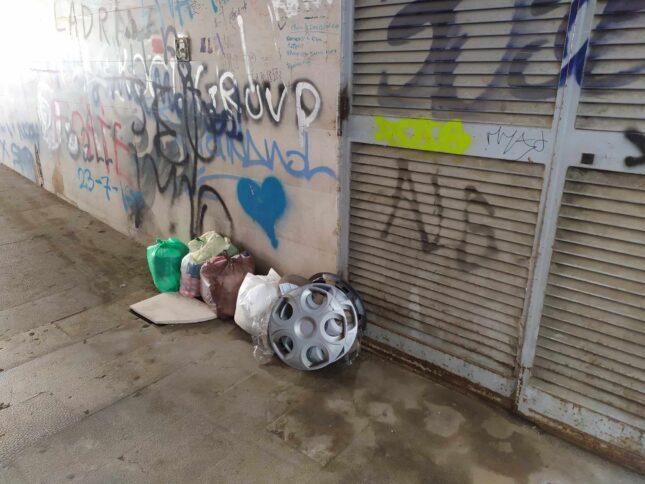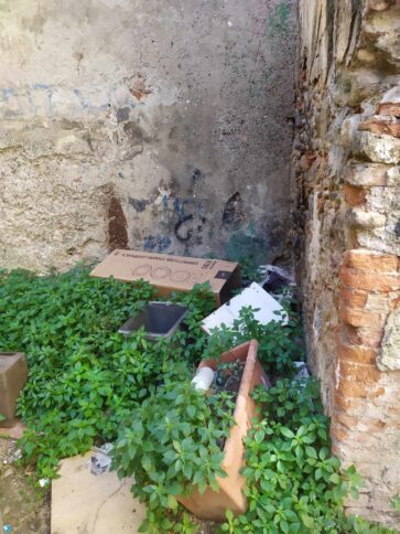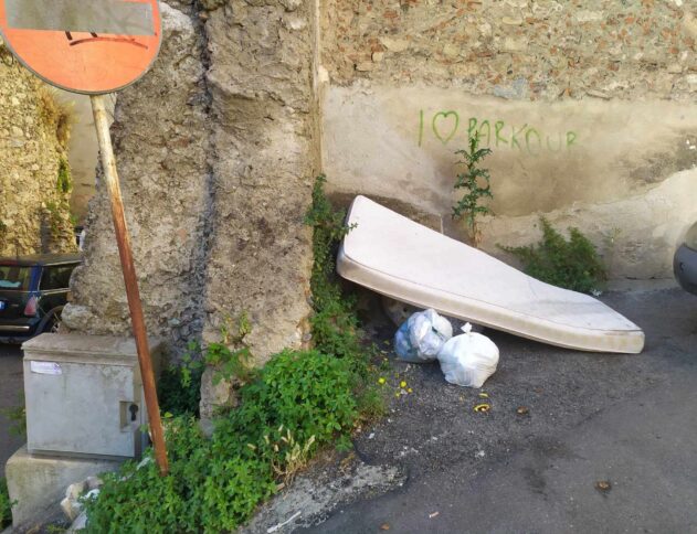 Largo Salvatore Giuliani è il parcheggio accanto al cinema San Nicola a cui conduce quel dedalo di traverse che costituiva il cuore del quartiere Rivocati. Zona che “regala” scorci di ordinario degrado (le foto risalgono a ieri mattina): un materasso vista sagrato plasticamente adagiato su un cumulo di sacchetti colmi di spazzatura, un mucchio di vasi, scatoloni e mastelli per la differenziata su cui ormai la vegetazione spontanea ha preso il sopravvento, ancora buste di immondizia e sedie rotte che ostruiscono il passaggio ai pedoni sul marciapiedi, altra spazzatura lasciata beffardamente a sfidare due cartelli “Area videosorvegliata dalla Polizia municipale” e “Divieto di deposito rifiuti”. E ancora: cerchioni di pneumatici, transenne che anziché tutelare un vicoletto lo trasformano in discarica di sedie, bidoni e calcinacci.