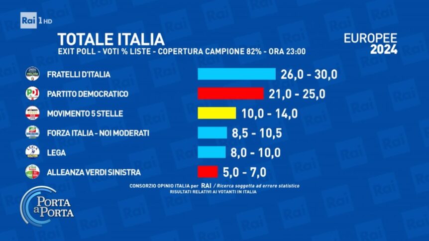 Nel primo exit poll per le Europee 2024 Fdi è il primo partito con il 26,5%, seguito dal Pd con il 23%. Sono i dati instant/Previsione Youtrend – Sky TG24. Terzo partito è il Movimento 5 Stelle con il 12,5%. Nel centrodestra, Fi al 9,5% si posiziona davanti alla Lega che raggiunge il 9%. Per gli altri schieramenti, Avs al 5,5%, Sue 4,5% e Azione al 3,5%. A urne chiuse, il primo exit poll di Opinio Rai dà Fratelli d’Italia avanti rispetto agli altri partiti. Fdi è tra il 26 e il 30%, il Pd tra il 21 e il 25%, Movimento 5 Stelle tra il 10 e il 14%, Forza Italia tra l’18,5-10%, Lega tra l’8 e il 10%, Alleanza Verdi Sinistra tra il 5 e il 7%.