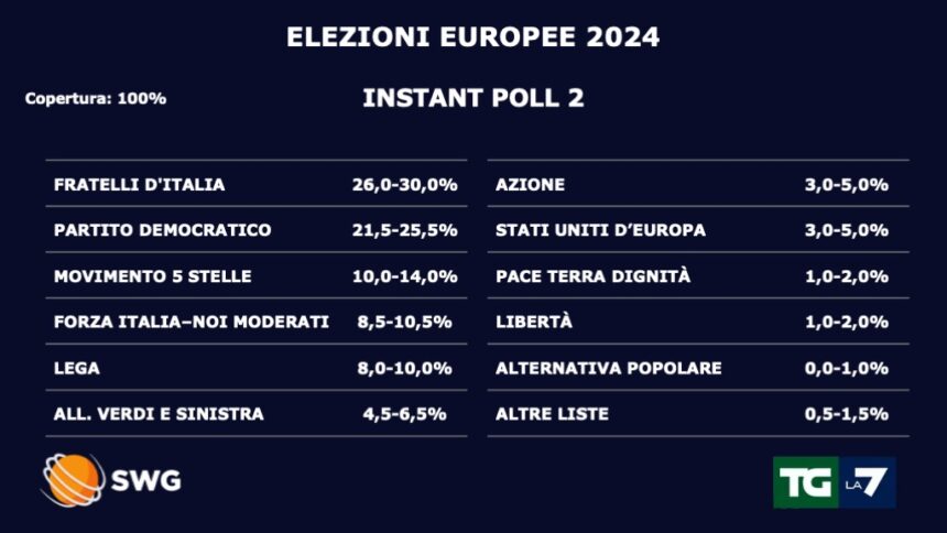Europee, i dati dei secondi instant poll: FdI tra il 26 e il 30% davanti al Pd