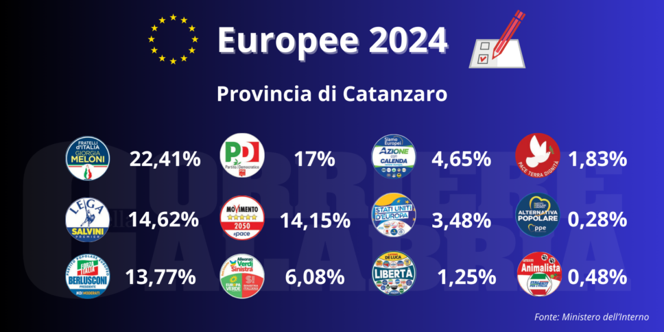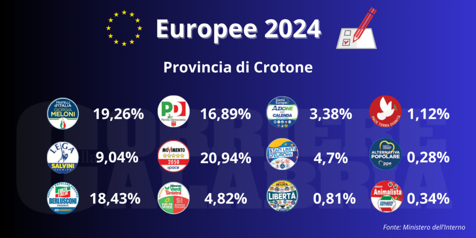 Nella provincia pitagorica l’ordine d’arrivo ricalca a grandi linee quello di Cosenza, al primo posto il Movimento 5Stelle con il 20,94%, poi FDI al 19,26%, Forza Italia che supera il 18% ed il PD che sfiora il 17%.Seguono la Lega al 9,7% e Alleanza Verdi Sinistra al 4,82%.