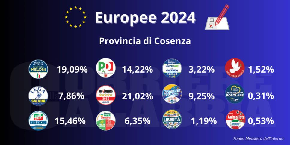 Exploit cosentino per Stati Uniti d’Europa che raggiunge quota 9,25%, dato trainato dalla candidata Filomena Greco che ottiene ben 13.814 preferenze personali. Inferiore alla media regionale il dato della Lega che raggiunge il 7,86%, 8.171 le preferenze ottenute dalla deputata Simona Loizzo, distanziato di molto il Presidente del Consiglio regionale Filippo Mancuso, i suoi 1.913 voti confermano gli schemi “in opposizione” all’interno dei salviniani.
