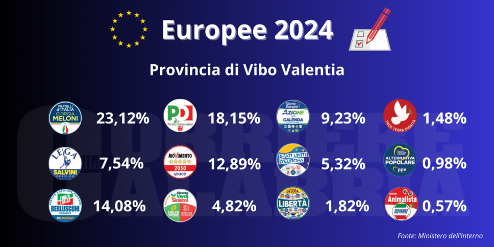 In terza posizione e distante dal risultato complessivo regionale Forza Italia che a Vibo ottiene “solo” il 14,08% Si ferma di poco sotto il 13% il Movimento Cinquestelle, Azione conquista a Vibo invece la percentuale più alta con il 9,13%, un dato trainato dalla performance significativa dal candidato vibonese e segretario regionale Francesco De Nisi. Sempre in provincia di Vibo Valentia il risultato più basso della Lega che si ferma al 7,54%.