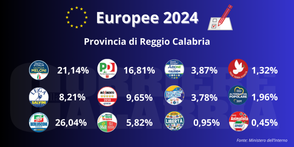 Atteso alla prima prova elettorale di una certa consistenza e con il contributo della candidata “ufficiale” di Forza Italia in Calabria, il coordinatore regionale Francesco Cannizzaro è riuscito a spuntare nella sua provincia il risultato percentuale più alto con un rotondo 26,04%. Poco più di 30.000 le preferenze ottenute da Giusy Princi. Staccato il seconda posizione Fratelli d’Italia con il 21,14%, a seguire il Partito Democratico con il 16,81%. In sofferenza in riva allo Stretto il Movimento cinquestelle la cui percentuale raggiunge quota 9,65%, per la Lega invece l’ 8,21%. Alleanza Verdi e Sinistra ottiene invece il 5,82% trainata dalle 6.047 preferenze ottenute da Mimmo Lucano. Piccola e forse scontata curiosità, Alleanza Verdi e Sinistra ottiene a Riace, patria dell’ex sindaco e candidato Mimmo Lucano, il 37,57%. (redazione@corrierecal.it)