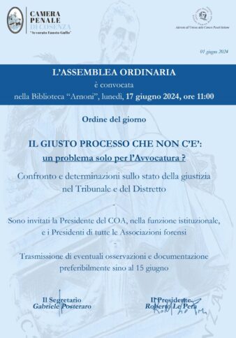Per questa ragione, per discutere di questi temi attuali e gravi, gli avvocati di Cosenza hanno indetto in tribunale, il prossimo lunedì, 17 giugno, l’assemblea della camera penale di Cosenza, invitando il presidente del Coa di Cosenza, il coordinatore delle camere penali calabresi, tutti i presidenti delle camere penali della Calabria e le associazioni del foro bruzio. “Al termine gli iscritti alla camera penale assumeranno le necessarie determinazioni”.