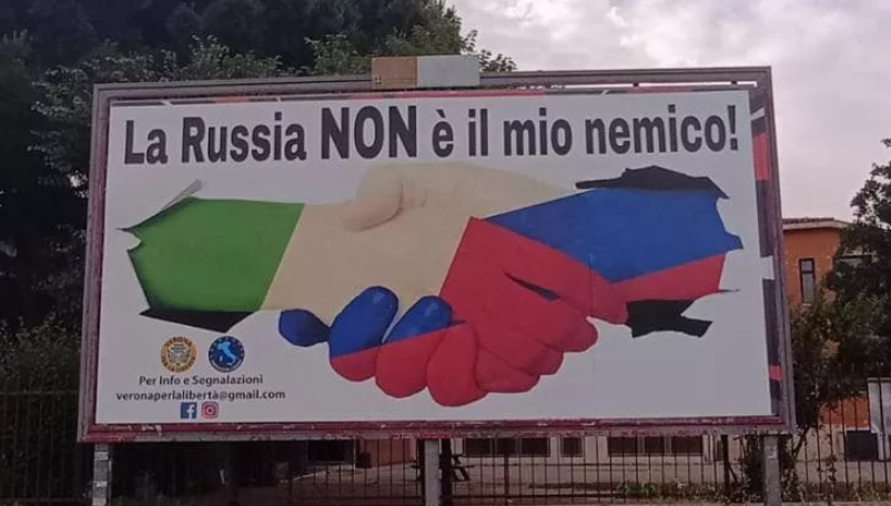 A Verona, dicevamo, nei giorni scorsi aveva destato molto scalpore il manifesto apparso con la scritta «La Russia NON è il mio nemico». In questo caso la “firma” sui manifesti sono i militanti dell’associazione “Verona per la libertà” (insieme a “Sindacato libero” e associazione “Veneto-Russia”). Si tratta – come ha spiegato Paolo Berizzi in un articolo su Repubblica – di una sigla fondata da dirigenti di Forza Nuova ed ex leghisti e nata per protesta contro il green pass. Poi, dopo la fine della pandemia, “Verona per la libertà” si è buttata sul conflitto Russia-Ucraina prendendo le difese di Mosca e organizzando eventi e manifestazioni a favore del popolo russo. Ma non è tutto.