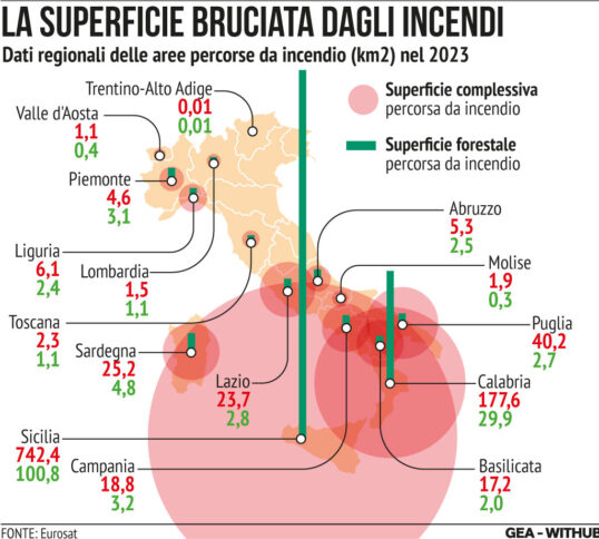 Incendi, in Calabria e Sicilia l’83% della superficie colpita nel 2023
