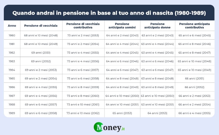 Quando vanno in pensione i nati tra il 1980 e il 1989 Fonte: Money.it