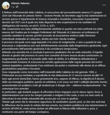 Vittorio Palermo ha trascorso invece ben 17 mesi di carcere duro per mafiosi e 19 mesi agli arresti domiciliari, che fanno tre anni di vita molto coincidenti con quelli del signor K. Lo scorso 5 giugno, il Rettore dell’Unical, alla luce dei nuovi provvedimenti, ha decretato la riammissione in servizio presso il Dipartimento di Scienze sociali e giuridiche revocando la sospensione determinata dal clamoroso arresto.