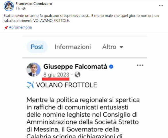 Cannizzaro quindi prosegue: «A proposito di chi a tutto questo non ci credeva, è una immensa soddisfazione vedere sulla mappa dell’Europa 7 nuove bandierine collegate a Reggio Calabria. Da dopo l’estate il nostro aeroporto dello Stretto sarà collegato a Londra, Parigi, Bruxelles, Francoforte, Katowice, Milano Malpensa e Pisa; 2 voli nazionali molto strategici e poi 5 voli internazionali con destinazioni che prima avremmo solo potuto sognare. Questo significa più possibilità per i nostri cittadini ed al contempo più possibilità e visibilità per le nostre città. Questo è ciò che mi rende più orgoglioso in assoluto. Anche se poi, almeno da quello che abbiamo visto finora, mi rendo conto – sostiene il coordinatore regionale di Forza Italia – che l’indotto amministrativo, commerciale, logistico, non è ancora all’altezza di questi flussi. Come già detto in passato, adesso tocca al tessuto sociale, ai cittadini, agli imprenditori, agli amministratori. Sono certo che adesso, toccando con mano cosa significhi tutto questo, ogni reggino, ogni calabrese si renderà conto che una chance così non ritornerà mai più». Ma la presentazione delle nuove rotte di Ryanair offre a Cannizzaro anche lo spunto per una polemica politica – con il Comune di Reggio Calabria sullo sfondo – con il sindaco Giuseppe Falcomatà. Oggi su facebook Cannizzaro riprende un post del giugno 2023 di Falcomatà, dal titolo “Volano frottole”, nel quale il primo cittadino reggino sosteneva che “Ryanair non volerà su Reggio e l’aeroporto non dà segni di vita”, e quindi contrattacca: «Esattamente un anno fa qualcuno si esprimeva così… E meno male che quel giorno non era un sabato, altrimenti volavano frittole... », scrive sui social Cannizzaro.