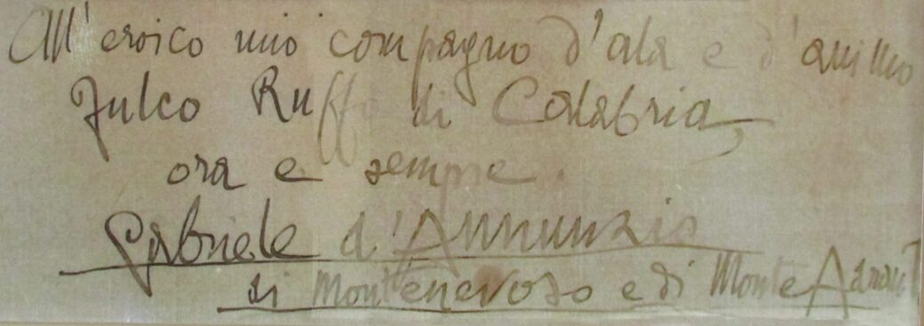 Fulco Ruffo senior, nobile dei principi di Scilla e duca di Guardia Lombarda oltre che conte di Sinopoli, allo scoppio della prima Guerra Mondiale rientra nelle forze armate lasciando la cavalleria per entrare in aviazione: riceverà un primo elogio nel novembre 1915 poi la Medaglia di Bronzo al Valor Militare e a seguire lunga serie di altre medaglie: ancora quattro di Bronzo, due d’Argento, la seconda delle quali lo proclama “Asso dell’aviazione”, fino alla Medaglia d’Oro al Valor Militare, nel 1917. Il 6 aprile 1934 è nominato Senatore del Regno e il 17 maggio del 1939 riceve il grado di Maggiore dell’Aeronautica. Tra i “meriti sul campo” meno ufficiali ma ugualmente prestigiosi una dedica da parte di Gabriele d’Annunzio che lo definisce «compagno d’ala» (foto in basso, da fb). (redazione@corrierecal.it)