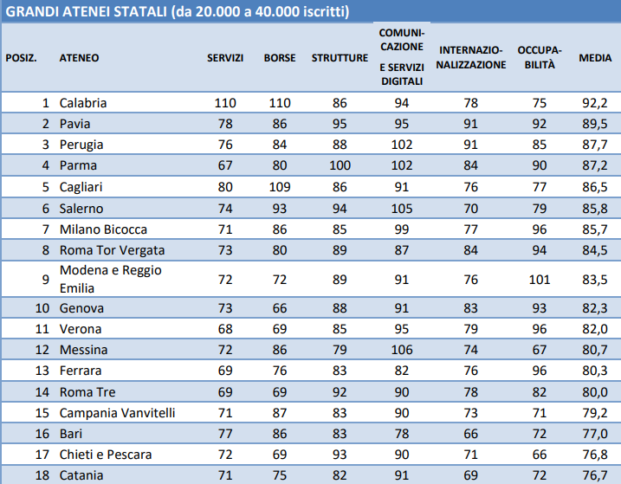 COSENZA L’Università della Calabria si colloca al vertice della classifica dei grandi atenei statali (da 20.000 a 40.000 iscritti) con un punteggio totale di 92,2, superiore a quello dell’Università di Pavia (89,5), che retrocede in seconda posizione. Nella classifica Censis delle Università italiane, giunta alla ventiquattresima edizione, terza in graduatoria è l’Università di Perugia (87,7), seguita dall’Università di Parma (87,2) e dall’Università di Cagliari (86,5), che avanzano, guadagnando il quarto e quinto posto. Salda in sesta posizione, al pari dello scorso anno, è l’Università di Salerno (85,8). Segue in settima posizione l’Università di Milano Bicocca (85,7), a cui si accoda l’Università di Roma Tor Vergata (84,5). Stabile in nona posizione l’Università di Modena Reggio Emilia (83,5), mentre l’Università di Genova, scalando una posizione riesce a posizionarsi tra i primi dieci grandi atenei statali, con un punteggio complessivo di 82,3. All’undicesimo posto l’Università di Verona (82,0) e al dodicesimo l’Università di Messina (80,7) che guadagna ben 4 posizioni. L’Università di Ferrara (80,3) e l’Università di Roma Tre (80,0) scalano entrambe una posizione guadagnando il tredicesimo e il quattordicesimo posto. Si qualificano come quindicesima e sedicesima l’Università della Campania (79,2), che perde due posizioni, seguita dall’Università di Bari (77,0), new entry tra i grandi atenei, perché fino allo scorso anno apparteneva al gruppo dei mega atenei statali. Chiudono la classifica, in penultima ed ultima posizione l’Università di Chieti e Pescara (76,8) e l’Università di Catania (76,7).