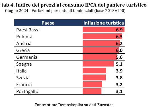 Sul versante della dinamica dei prezzi, nel mese di giugno 2024, inoltre, Demoskopika calcola un tasso di inflazione turistica in aumento dell’1,2% su base mensile (inflazione congiunturale) e del 3,6% su base annua (inflazione tendenziale) dovuto in gran parte ai servizi ricettivi e di ristorazione che assorbono l’86% dell’incremento tendenziale dei prezzi. Nel confronto, inoltre, con le principali destinazioni turistiche europee, l’indice armonizzato dei prezzi al consumo (Ipca) fa registrare incrementi su base annua per l’Italia del tasso di inflazione turistica tra i meno alti del Vecchio Continente: 3,9% la dinamica dei prezzi del “paniere turistico” calcolato da Demoskopika che colloca il Belpaese al quarto posto tra le destinazioni “meno inflazionate” preceduto soltanto da Svezia (3,8%), Francia (3,2%) e Portogallo (3,1%). Per il mese di agosto, infine, i flussi in Italia potrebbero generare una spesa turistica pari a oltre 18,8 miliardi di euro con una variazione in crescita del 4,7% rispetto allo stesso periodo del 2023. È quanto emerge dalla nota previsionale “Tourism Forecast Summer August 2024” dell’Istituto Demoskopika.