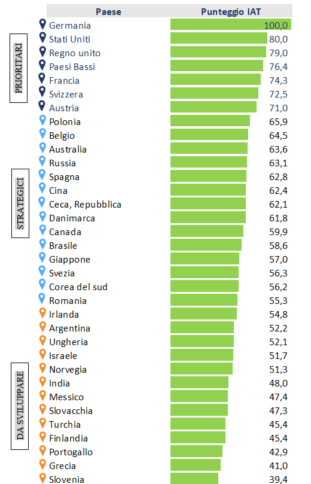 Quali sono i mercati maggiormente attratti dalla destinazione Italia? Sarebbero 7 i paesi, su un totale di 47 aree sotto osservazione, inclusi nel raggruppamento dei cosiddetti “mercati prioritari” dell’Indice di Attrattività Turistica (Iat) ideato da Demoskopika per misurare l’appeal di una destinazione turistica. Quattro i parametri individuati: permanenza media dei turisti, quota di mercato degli arrivi, tasso di crescita turistica e spesa turistica pro capite. E così nel cluster dei “più attratti” dal belpaese (mercato prioritario) figurano Germania con il massimo del punteggio attribuito (100,0 punti), Stati Uniti (80,0 punti), Regno Unito (79,0 punti), Paesi Bassi (76,4 punti). E, ancora, Francia (74,3 punti), Svizzera (72,5 punti) e Austria (71,0 punti).