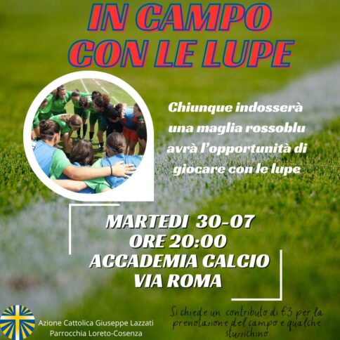 COSENZA Dopo la mancata iscrizione (non ancora spiegata da parte del club) del Cosenza calcio femminile al campionato di serie C, le ragazze rossoblù martedì 30 luglio alle ore 20 torneranno in campo nell’Accademia calcio via Roma di via Misasi per un evento che mira a tenere viva l’attenzione sul caso. L’iniziativa, dal titolo “In campo con le Lupe” è organizzato dall’Azione Cattolica Giuseppe Lazzati della Parrocchia di Loreto. «Chiunque indosserà una maglia rossoblù – riporta la locandina – avrà l’opportunità di giocare con le Lupe». La serata comprenderà, appunto, una partitella con le ragazze rossoblù a cui seguirà un momento di dibattito in cui le calciatrici spiegheranno ai presenti come hanno vissuto l’esclusione dal campionato. Il dibattito sarà aperto a tutti.