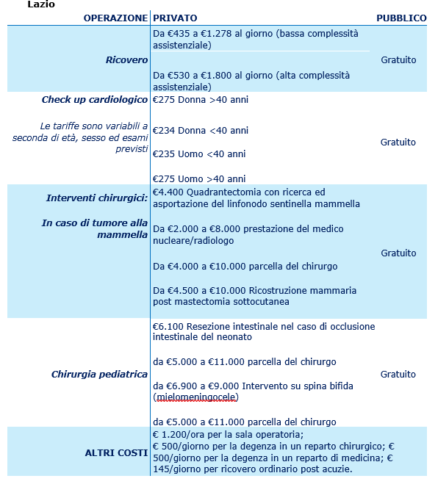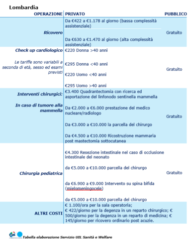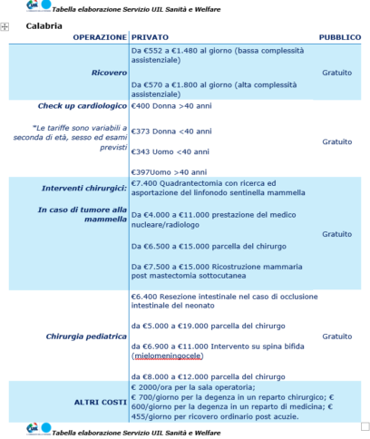 Le tabelle sopra riportate descrivono brevemente i costi di alcune prestazioni in regime privato, in Lombardia, nel Lazio e in Calabria. In sintesi, si può evincere che una persona che necessitasse di un ricovero per bassa complessità assistenziale, in assenza del SSN, dovrebbe sostenere una spesa giornaliera che varia da un minimo di 422€ fino a un massimo di €1.278 in Lombardia, da un minimo di 434€ a un massimo di 1.278€ nel Lazio e da un minimo €552€ a un massimo €1.480. Se il ricovero fosse ad alta complessità assistenziale, la somma aumenterebbe e si andrebbe da un minimo di € 630 fino a 1470 € al giorno in Lombardia da un minimo di 530€ a un massimo di 1.800€ nel Lazio e da un minimo di €570 a €1.800 al giorno in Calabria. Nel caso di un check up cardiologico, invece, pur tenendo conto che le tariffe sono variabili a seconda di età, sesso ed esami previsti, il costo in regime privato varia da un minimo di €220 a un massimo di 295€ per una donna e da un minimo di 220€ a un massimo di 295€ per un uomo in Lombardia, un minimo di €234 a un massimo di 275€ per una donna e da un minimo di 235€ a 275€ per un uomo nel Lazio, da un minimo di €373 a 400€ per una donna e da un minimo di 343€ a un massimo di 397€ per un uomo in Calabria. Per un intervento chirurgico, come l’asportazione del tumore alla mammella, il più delle volte seguita dalla radioterapia, se si dovesse ricorrere come unica soluzione al servizio privato, si dovrebbe sostenere una spesa che può arrivare sino a un massimo di €29.400 in Lombardia, €32.400 nel Lazio e € 48.400 in Calabria. Infine, per la chirurgia pediatrica, per risolvere un’occlusione intestinale del neonato, o per affrontare casi più gravi come quelli correlati a una spina bifida, il costo varia dai €4.300 ai €9.000 in Lombardia, €6.100 ai €9.000 nel Lazio e da 6.400€ ai 11.000€ in Calabria.