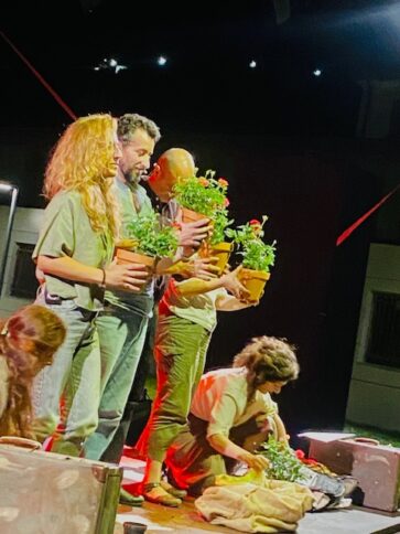 COSENZA Iniziamo dalla fine. Da quando sul proscenio compaiono vasi, rastrelli, sacchi di terriccio e gli attori piantano rose rosse. Come ad offrirle al pubblico ma soprattutto a loro, ad Antonello Antonante e a Franco Dionesalvi. Come a dire, la vostra opera, il vostro progetto di vita e arte ancora e sempre fiorirà. Il basco dell’uomo di teatro e il sombrero del poeta sono uno accanto all’altro, sotto un fascio di luce.